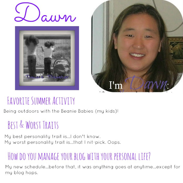 Hi! I’m Dawn from Dawn’s Disaster. I write a small blog about my family life and have some product reviews and giveaways. During the week, I host or co-host two blog hops {Super Sunday Sync and #BlogTwitLov (Wednesdays)}. I also started a short prompt series called 20 Tuesdays, but I will be bringing back Traveling Tuesdays after that is over. I also contribute to the Mommy Blog Hoppers every other Monday.